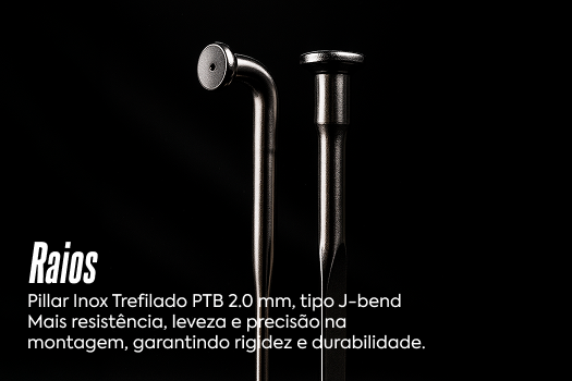 O aro em alumínio de alta durabilidade, com perfil reforçado, oferece maior segurança contra impactos e deformações comuns em terrenos irregulares. Sua construção estável garante condução firme, previsível e sem surpresas seja em subidas longas, descidas rápidas ou estradas de terra batida.